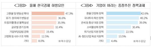 이에 따라 정부에 바라는 중점 정책 과제로도 ‘환율 안정화 정책(42.6%)’이 1순위로 지목됐으며 국내 투자 촉진(40.2%)과 통상 대응 강화(39.0%)에 대한 목소리도 높았다.