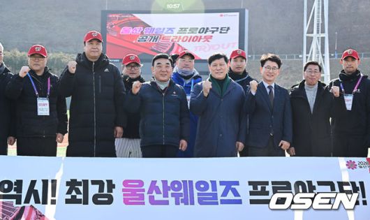 허구연 KBO 총재와 김두겸 울산 시장 그리고 울산 웨일즈 김동진 단장과 장원진 감독, 코치진이 기념촬영을 하고 있다. 2026.01.13 / foto0307@osen.co.kr