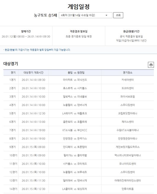 스포츠토토, 농구토토 승5패 4회차 오는 1월 14일(수) 오전 9시 30분 발매 마감