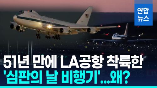 (서울=연합뉴스) '심판의 날 비행기'(Doomsday Plane) '종말의 날 비행기' '최후의 날 비행기'로 불리는 미 공군 공중지휘통제기 'E-4B 나이트워치'가 미국 로스앤젤레스 국제공항(LAX)에 착륙하는 모습이 포착됐습니다.