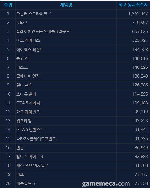▲ 1월 13일 오후 12시 기준 스팀 일 최고 동시접속자 TOP 20 (자료출처: 스팀) |