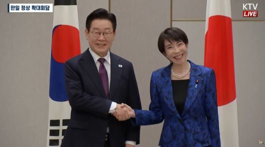 일본을 방문한 이재명 대통령이 13일 오후 일본 나라현에서 다카이치 사나에 일본 총리와 정상회담에 앞서 악수하고 있다. [사진=KTV] |