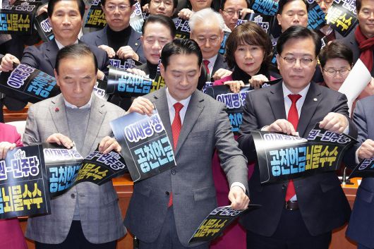 이날 장 대표, 송 원내대표 및 소속 의원들과 당협위원들은 의원총회에서 ‘이재명 정권-더불어민주당 공천헌금·뇌물수수 규탄’이라고 적힌 돈 봉투 모양의 피켓을 찢는 퍼포먼스를 벌였다. 이들은 “더불어민주당 공천헌금 진실규명 특검하라” 등의 구호를 연달아 외치기도 했다.