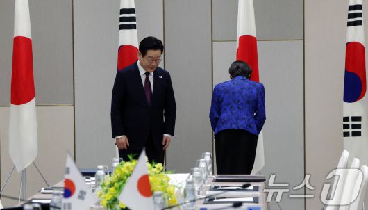 (나라(일본)=뉴스1) 이재명 기자 = 다카이치 사나에 일본 총리가 13일 일본 나라현 한일 정상회담장에서 이재명 대통령과 악수 후 자리로 향하기 전 국기에 예를 표하고 있다. 2026.1.13/뉴스1