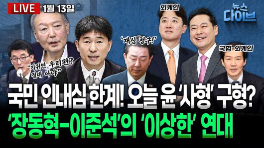 출연: 양지열 변호사, 박영식 시사평론가, 오윤혜 방송인, 신인규 변호사, 권태호 한겨레 논설실장, 진행: 고현준. 이 대통령의 ‘실용외교’ 릴레이! 이번엔 한-일 정상회담 / 지귀연이 방치한 ‘침대변론’... 오늘 윤 ‘사형’ 구형 나오나? / 끝까지 반성은 없었다... 15년 구형받은 이상민 / 김건희 메모장 확보...나경원 낙마·김기현 움직인 ‘정치 바둑판’ / 이 대통령 “당 의견 수렴” 지시... 논란의 검찰개혁 법안! 향방은? / 김병기 ‘제명’ 징계에 ‘재심 청구’로 반발 / 연대는 하나 지방선거 연대는 없다? 장동혁-이준석 ‘기묘한 연대’ 오늘 (1월 13일) 뉴스 다이브 많은 시청바랍니다.