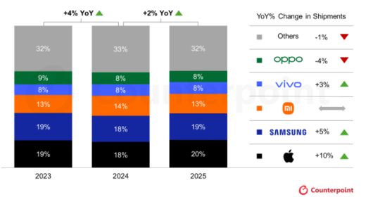 브랜드별로 보면 애플이 출하량 기준 시장 점유율 20%를 기록해 1위 자리를 탈환했다. 애플 출하량은 전년 대비 10% 증가해 상위 5개 브랜드 가운데 가장 높은 성장률을 기록했다. 아이폰 17 시리즈의 흥행과 함께 아이폰 16이 일본·인도·동남아 시장에서 꾸준한 판매 성과를 낸 점이 영향을 미친 것으로 분석됐다. 코로나19 시기 구매자들의 교체 수요가 본격화된 점도 출하량 확대에 기여한 것으로 풀이된다.