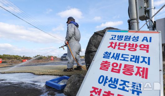 [제주=뉴시스] 우장호 기자 = 지난 12일 오전 제주시 구좌읍 하도리 철새도래지 인근 도로에서 고병원성 조류인플루엔자(AI) 차단 방역을 하고 있다. 제주도에 따르면 지난 5일 서귀포시 성산읍 시흥리 해변 아생조류 분변에서 올겨울 첫 고병원성 AI가 검출돼 항원 검출 지역 지점 반경 10㎞ 지역을 '야생조류 예찰 지역'으로 설정해 가금류에 대한 이동이 제한된 상태다. 2026.01.12. woo1223@newsis.com |