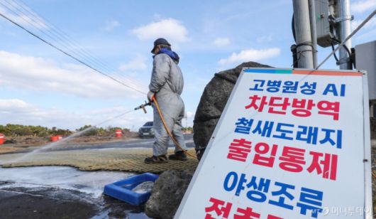 [제주=뉴시스] 우장호 기자 = 12일 오전 제주시 구좌읍 하도리 철새도래지 인근 도로에서 고병원성 조류인플루엔자(AI) 차단 방역을 하고 있다. 제주도에 따르면 지난 5일 서귀포시 성산읍 시흥리 해변 아생조류 분변에서 올겨울 첫 고병원성 AI가 검출돼 항원 검출 지역 지점 반경 10㎞ 지역을 '야생조류 예찰 지역'으로 설정해 가금류에 대한 이동이 제한된 상태다. 2026.01.12. woo1223@newsis.com /사진=우장호 |