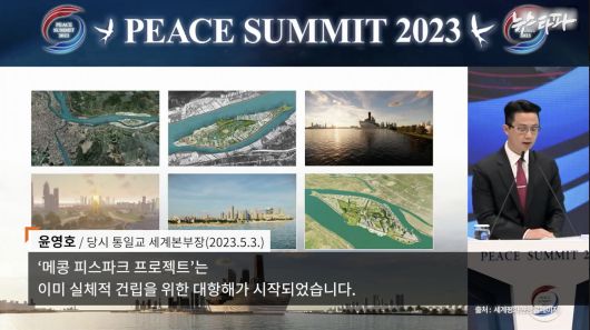 2023년 5월 3일, 윤영호 당시 통일교 세계본부장이 메콩 피스파크 프로젝트를 설명하는 모습.