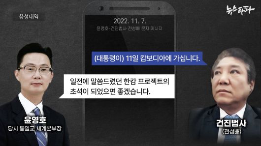 제가 3월 22일날 (윤석열) 대통령을 뵀습니다. 1시간 독대를 했습니다. 많은 얘기가 있었습니다. 동의한 내용도 있었습니다. 동의한 내용이 있었기 때문에 들어가는 겁니다.윤석열 씨는 대통령 임기 시작 반 년 뒤인 2022년 11월, 캄보디아를 방문했다. 이를 앞두고 통일교의 실세였던 윤영호 당시 세계본부장과 윤석열-김건희 부부의 최측근으로 알려진 건진법사 전성배 씨는 다음과 같은 내용의 문자 메시지를 주고 받았다.