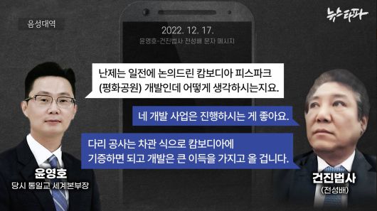 ●윤영호 : 난제는 일전에 논의드린 캄보디아 피스파크(평화공원) 개발인데 어떻게 생각하시는지요.통일교 실세가 ‘캄보디아 피스파크 개발’이란 얘기를 한다. 그러자 윤석열 정권의 실세는 한-캄 우정의 다리를 지렛대 삼아 개발 사업을 추진하라는 취지로 말한다.