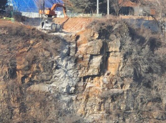 관광객 유치를 위한 현수교 공사로 파괴되고 있는 영월 낙화암을 모습 |
