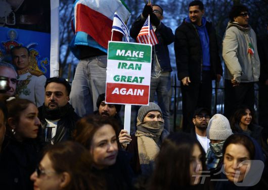12일(현지시간) 영국 런던 중심부에 위치한 이란 대사관 앞에서 이란 정권 반대 시위대가 이란 국기를 흔들고 있다. 2026.01.12. ⓒ AFP=뉴스1 ⓒ News1 이정환 기자 |