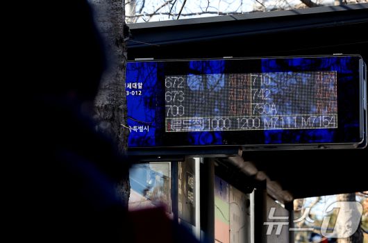 서울 시내버스 노동조합이 무기한 전면파업에 돌입한 13일 서울 서대문구 인근 버스정류장 전광판에 표시된 노선버스의 위치가 '차고지'로 표시되고 있다. 2026.1.13/뉴스1 ⓒ News1 이호윤 기자 |