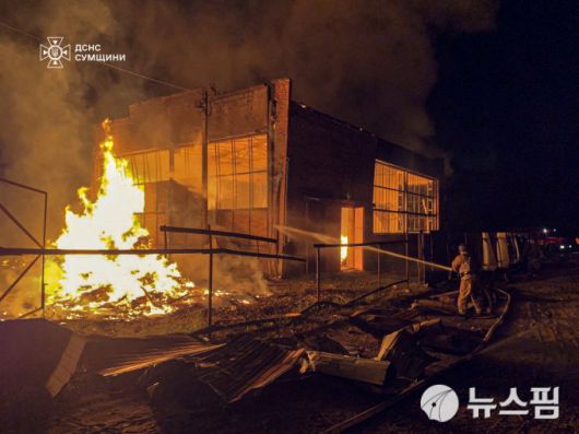 2025년 8월 20일, 우크라이나 수미 지역의 러시아 드론 공습 현장에서 소방관들이 작업하고 있는 모습.[사진=로이터 뉴스핌] |