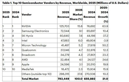 엔비디아는 업계 최초로 연 매출 1000억달러를 돌파했다. 작년 매출 1위(점유율 15.8%)를 차지한 엔비디아는 전년 대비 63.9% 성장한 1257억300만달러(185조3697억원)를 기록했다.