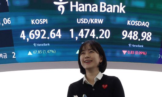 코스피는 연일 최고치 경신 코스피가 전날 대비 1.47% 상승한 4692.64로 장을 마감해 또다시 사상 최고치를 경신한 13일 오후 서울 중구 하나은행 딜링룸 현황판에 코스피 지수와 원·달러 환율이 표시돼 있다. 코스피는 새해 들어 8거래일 연속 상승기록을 이어갔고 정부가 천명한 ‘오천피’(코스피 5000)를 불과 6.55% 남겨뒀다. 원·달러 환율은 서울외환시장에서 전장 대비 5.30원 오른 1473.70원에 주간 거래를 마쳤다. 연합뉴스 |
