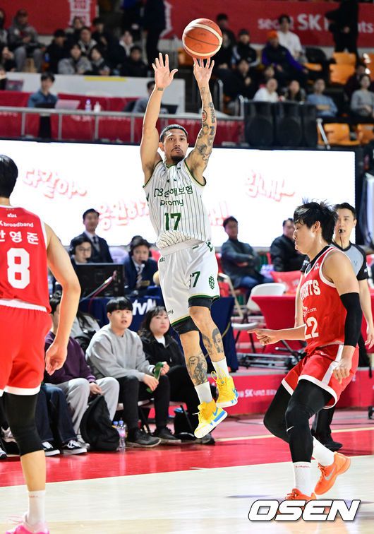 [OSEN=잠실학생체, 지형준 기자] 19일 오후 서울 잠실학생체육관에서 2025-2026 LG전자 프로농구 서울 SK와 원주 DB의 경기가 열렸다. SK는 17승 13패 4위, 8연승에 도전하는 DB는 20승 10패 2위를 기록중이다. 1쿼터 DB 알바노가 3점슛을 성공시키고 있다. 2026.01.13/ jpnews@osen.co.kr