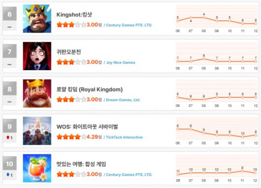 지난주 4위까지 치솟았던 ‘킹샷’은 6위로 하락했고, 단기간에 차트 상위권에 안착했던 ‘귀판오분전’은 7위를 유지하며 안정 국면에 들어갔다. ‘로얄 킹덤’은 8위, 한때 종말 생존 장르의 대표주자였던 ‘WOS: 화이트아웃 서바이벌’은 9위로 밀려나며 연초 랭킹 재편의 영향을 피하지 못했다.