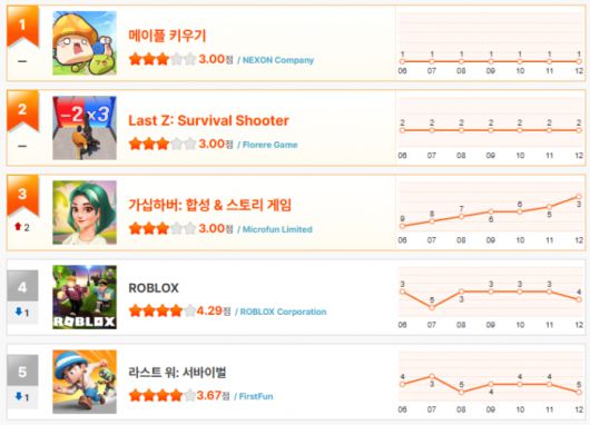 지난주 3위에 머물렀던 ‘라스트Z: 서바이벌 슈터’는 새해와 함께 다시 탄력을 받으며 2위로 한 계단 상승했다. 반면 겨울방학 특수로 2위를 지켜오던 ‘로블록스’는 4위로 하락, 연초 랭킹 재편 과정에서 잠시 숨 고르기에 들어간 모습이다.