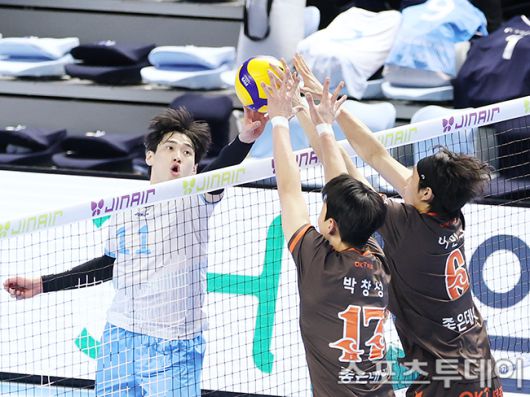 [인천=스포츠투데이 권광일 기자] 2025-2026 진에어 V-리그 남자부 대한항공-OK저축은행 경기가 13일 인천 계양체육관에서 열렸다. 대한항공 김선호가 네트에서 공을 밀어넣고 있다. 2026.01.13. [스포츠투데이 권광일 기자 sports@stoo.com]