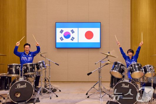 이재명 대통령과 다카이치 사나에 일본 총리가 13일 일본 나라현 회담에서 푸른색 유니폼을 함께 착용하고 즉석 드럼 협주를 하고 있다. 청와대는 이날 한일 정상회담과 관련해 "다카이치 총리가 이재명 대통령에게 드럼 스틱을 선물하고, 즉석에서 드럼 연주 방법을 직접 설명하며 합주를 이끌었다"고 밝혔다. (공동취재) 2026.1.13/뉴스1 ⓒ News1 이재명 기자"> |