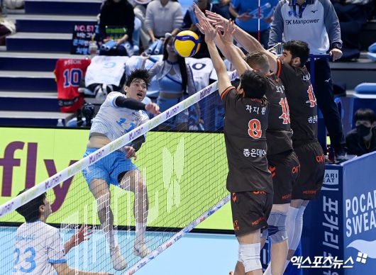 (엑스포츠뉴스 인천, 고아라 기자) 13일 오후 인천 계양체육관에서 열린 '진에어 2025-2026 V-리그' 대한항공과 OK저축은행의 경기, 대한항공 김선호가 공격을 시도하고 있다.고아라 기자 iknow@xportsnews.com