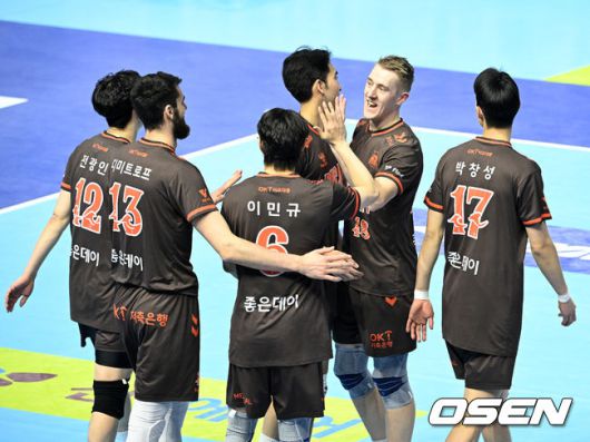 [OSEN=인천, 이대선 기자] 13일 오후 인천 계양체육관에서 프로배구 진에어 2025~26 V리그 대한항공과 OK저축은행의 경기가 열렸다. 대한항공은 승점 41(14승 6패)로 1위, OK저축은행은 승점 31(10승 11패)로 5위를 기록하고 있다. 4세트 OK저축은행 선수들이 득점에 환호하고 있다. 2026.01.13 /sunday@osen.co.kr