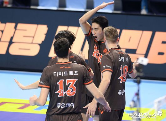 (엑스포츠뉴스 인천, 고아라 기자) 13일 오후 인천 계양체육관에서 열린 '진에어 2025-2026 V-리그' 대한항공과 OK저축은행의 경기, OK 차지환이 득점한 뒤 기뻐하고 있다.고아라 기자 iknow@xportsnews.com