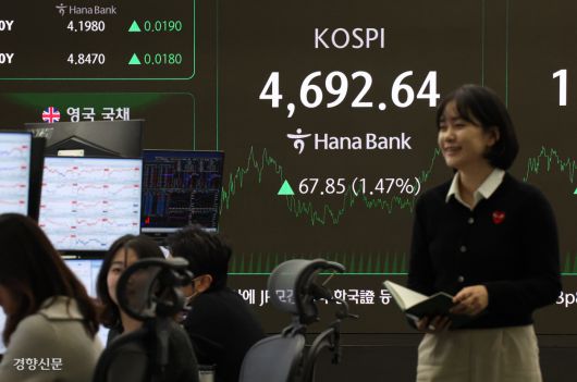 코스피가 사상 최고치를 갈아치우며 4700선 턱밑까지 오른 13일 서울 중구 하나은행 딜링룸 현황판에 코스피 종가가 표시돼 있다. 이날 코스피는 전거래일 대비 67.85(1.47%)포인트 상승한 4692.64로 장을 마쳤다.