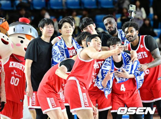 [OSEN=잠실학생체, 지형준 기자] 서울 SK가 13일 잠실학생체육관에서 개최된 2025-26 LG전자 프로농구 4라운드에서 원주 DB를 93-65로 이겼다. 4위 SK(18승 13패)는 2위 DB(20승 11패)의 8연승을 저지했다. SK 선수들이 승리 기념 셀카를 찍고 있다. 2026.01.13/ jpnews@osen.co.kr