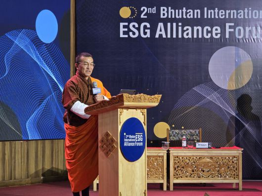 (부탄=국제뉴스) 유지현 기자 = 9일 부탄 팀푸시 부탄왕립대학교(RUB)에서 열린 제2회 부탄 국제 ESG 동맹포럼(The 2nd Bhutan International ESG Alliance Forum) 개막식에서 리키 도르지(Lyonpo Lekey Dorji) 부탄 재무장관이 축사를 했다.