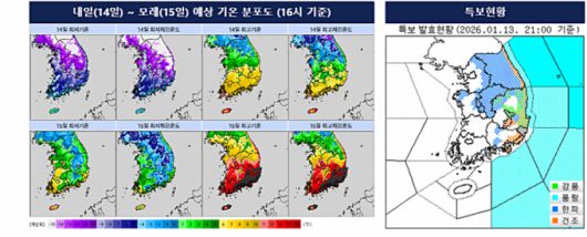 14~15일 예상기온 분포도(왼쪽)와 특보 현황[그래픽=기상청]2026.01.13 nulcheon@newspim.com |