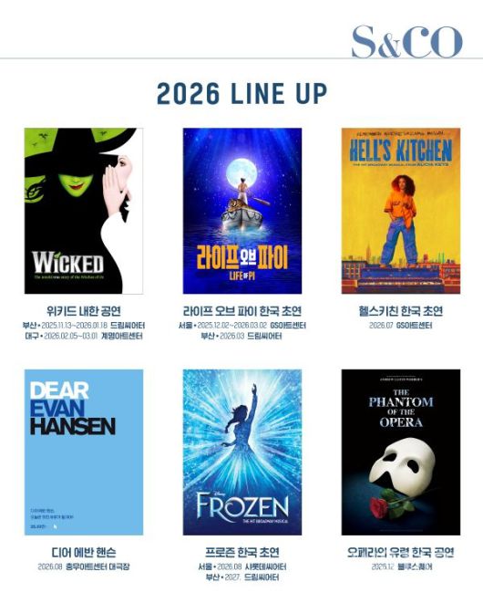 에스앤코는 그간 '캣츠', '라이온 킹', '알라딘', '하데스타운' 등 해외 주요 뮤지컬을 국내 및 아시아 시장에 소개해 왔다. 2026년 라인업에 대한 상세 정보는 추후 순차적으로 공개될 예정이다.