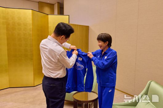 [나라=뉴시스] 고범준 기자 = 이재명 대통령이 다카이치 사나에 일본 총리와 함께 13일(현지 시간) 일본 나라현 회담장에서 일본 측이 마련한 푸른색 유니폼을 함께 착용하고 있다. (공동취재) 2026.01.13. bjko@newsis.com