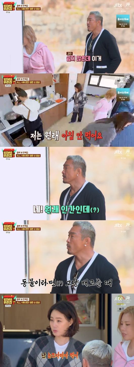 장영란의 음식을 맛본 추성훈은 감탄했다. 멤버들은 추성훈에게 아침을 챙겨 먹는지 물었고, 추성훈은 아침을 챙겨 먹지 않는다며 배고플 때 첫 끼를 먹는다고 밝혔다.