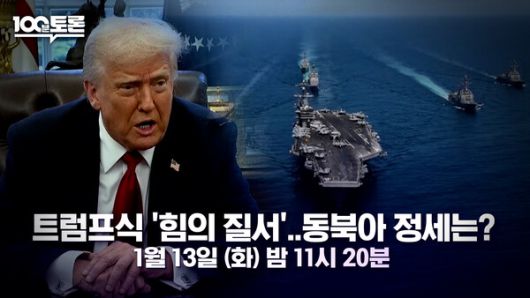 13일 밤 11시 20분 방송되는 '100분 토론'은 최근 미국의 대외 정책 방향이 동북아 지역에 미칠 영향을 짚는다. 지난 3일, 미국이 베네수엘라 니콜라스 마두로 대통령을 체포하기 위한 군사 작전을 단행했다. 체포 명분은 '인권탄압'과 '마약 밀매'였다. 해당 작전 이후, 트럼프 대통령은 "사회주의 정권이 강탈해 간 미국의 석유 시설을 되찾겠다"며 베네수엘라 석유 자원과 관련한 발언을 공개적으로 내놓아 국제사회의 주목을 받았다.