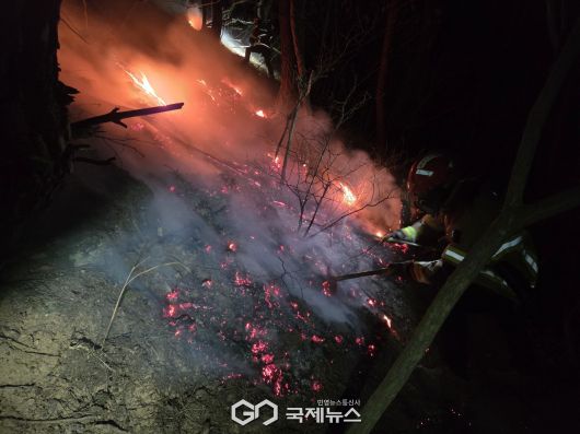 당시 현장은 겨울철 장기간 지속된 건조한 날씨와 돌풍성 강풍, 산악 지형이 겹치며 대형 산불로 확산할 위험이 매우 높은 상황이었다. 그러나 산불 발생 직후 도내 119산불신속대응팀 13개 대와 의용소방대 산불진화대 345명이 신속히 현장에 투입돼 체계적인 진화 작전을 펼쳤다.