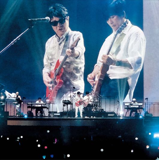 윤수정 기자 10일 서울 송파구 케이스포돔(올림픽체조경기장) 단독 공연 중 조용필이 노래 ‘미지의 세계’ 순서에서 기타를 메고 전속 밴드 ‘위대한 탄생’의 기타리스트 최희선(오른쪽)과 듀엣 연주를 선보이고 있다. |