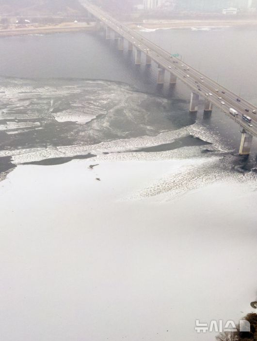 [서울=뉴시스] 조성우 기자 = 한파가 이어진 12일 경기 하남시 미사대교 인근 얼어붙은 한강 위로 눈이 쌓여 있다. 2026.01.12. xconfind@newsis.com |
