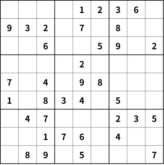 ※ 스도쿠 규칙: 숫자 1~9를 ①세로 9칸에 한 번씩만 써서 채운다. ②가로 9칸에도 한 번씩만 써서 채운다. ③굵은 선의 작은 사각형 3칸×3칸에도 한 번씩만 써서 채운다.
