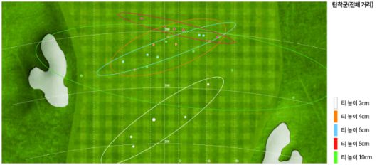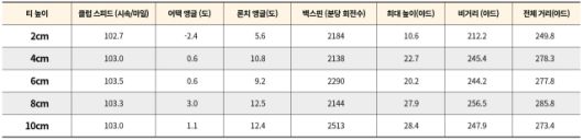 론치 앵글은 10.8도, 최고 고도는 22.7야드로 티 높이 2cm 때보다 수치가 약 2배로 증가했다. 덩달아 캐리 거리는 약 33야드 증가한 245.4야드, 전체 거리는 약 29야드 증가한 278.3야드로 찍혔다.