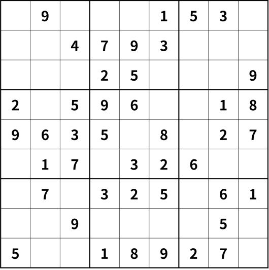 ※ 스도쿠 규칙: 숫자 1~9를 ①세로 9칸에 한 번씩만 써서 채운다. ②가로 9칸에도 한 번씩만 써서 채운다. ③굵은 선의 작은 사각형 3칸×3칸에도 한 번씩만 써서 채운다.