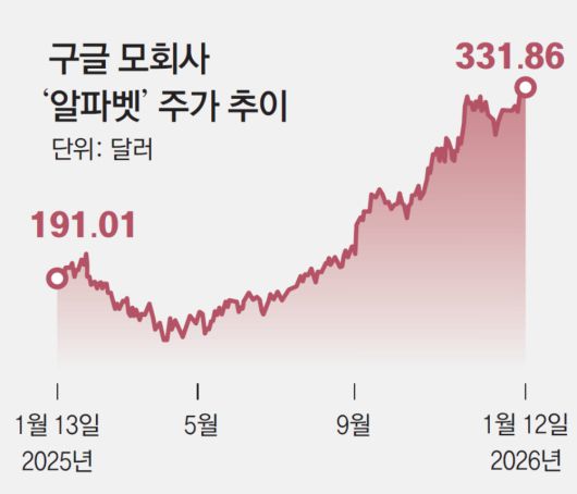 애플과 구글은 12일 구글 블로그에 공동 발표문을 내고 “차세대 애플 파운데이션 모델을 구글의 제미나이 모델과 클라우드 기술을 기반으로 구축하는 계약을 맺었다”고 밝혔다. 이 소식이 전해지면서 이날 구글의 모회사 알파벳의 주가가 상승해 시가총액 4조 달러(약 5898조 원)를 돌파했다. 엔비디아·MS·애플에 이어 사상 네 번째 기업이다. 알파벳 주가는 지난해 1월 13일 종가 기준 191.01달러였는데, 12일 종가가 331.86달러로 73.74% 올랐다.