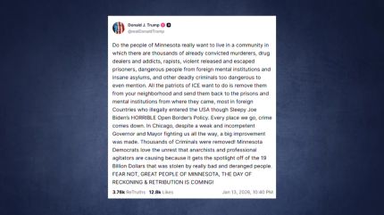트럼프 대통령은 현지 시간 13일 SNS 트루스소셜에 올린 글에서 "미네소타 사람들은 수천 명의 살인범, 마약상과 중독자, 강간범, 석방되거나 탈주한 죄수들이 있는 곳에서 정말로 살고 싶나"라고 물었습니다.