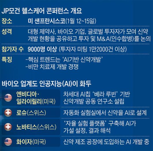 이날 오전 9시쯤 미 샌프란시스코 더 웨스틴 세인트 프랜시스 호텔 인근은 JP모건 헬스케어 콘퍼런스에 참여하려고 세계 곳곳에서 찾아온 투자자들과 바이오 업계 관계자들로 붐볐다. JP모건 헬스케어 투자 글로벌 공동 총괄 제러미 멜먼은 개막 연설에서 “AI는 제약·바이오 업계 전반의 패러다임을 바꿀 것”이라고 했다.