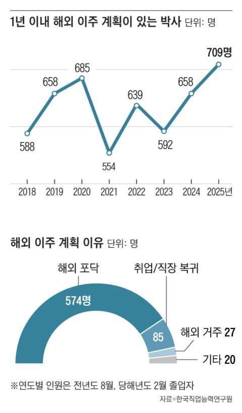 한국직업능력연구원이 지난해 박사 학위를 취득한 한국인 8345명을 전수 조사한 ‘국내 신규 박사 학위 취득자의 특성과 초기 노동시장 이행 실태 조사’에 따르면, 1년 이내 해외 이주 계획이 있는 박사가 709명으로 2018년(588명)보다 121명(20.6%) 늘어난 것으로 나타났다. 해외 이주 계획이 있는 박사 가운데 공학 계열이 310명(43.7%), 자연 계열이 244명(34.4%)이었다.
