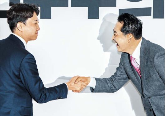 뉴시스국민의힘 장동혁(오른쪽) 대표와 개혁신당 이준석 대표가 13일 국회에서 만나 악수하고 있다. |