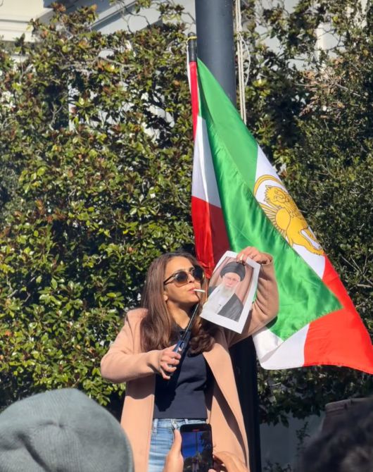 미국 캘리포니아주(州)에서 일어난 이란 반정부 시위에서 한 이란인 여성이 이란 왕정복고 깃발 앞에 서서 담뱃불에 하메네이 이란 최고지도자의 사진을 불태우고 있다. /인스타그램 |