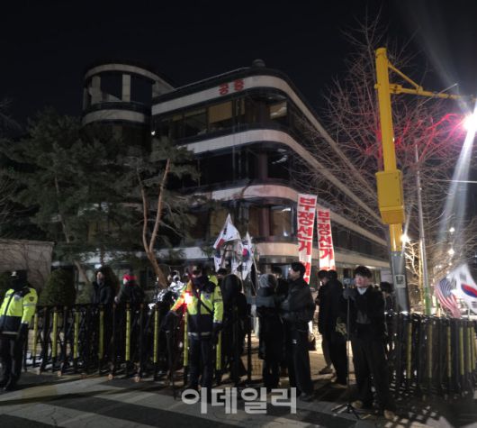 윤석열 전 대통령의 내란 결심공판이 열린 14일 새벽 1시 40분께 윤 전 대통령 지지자들이 서울 서초구 서울중앙지방법원 앞에서 피켓을 들고 윤 전 대통령을 응원하고 있다.(사진=백주아 기자) |